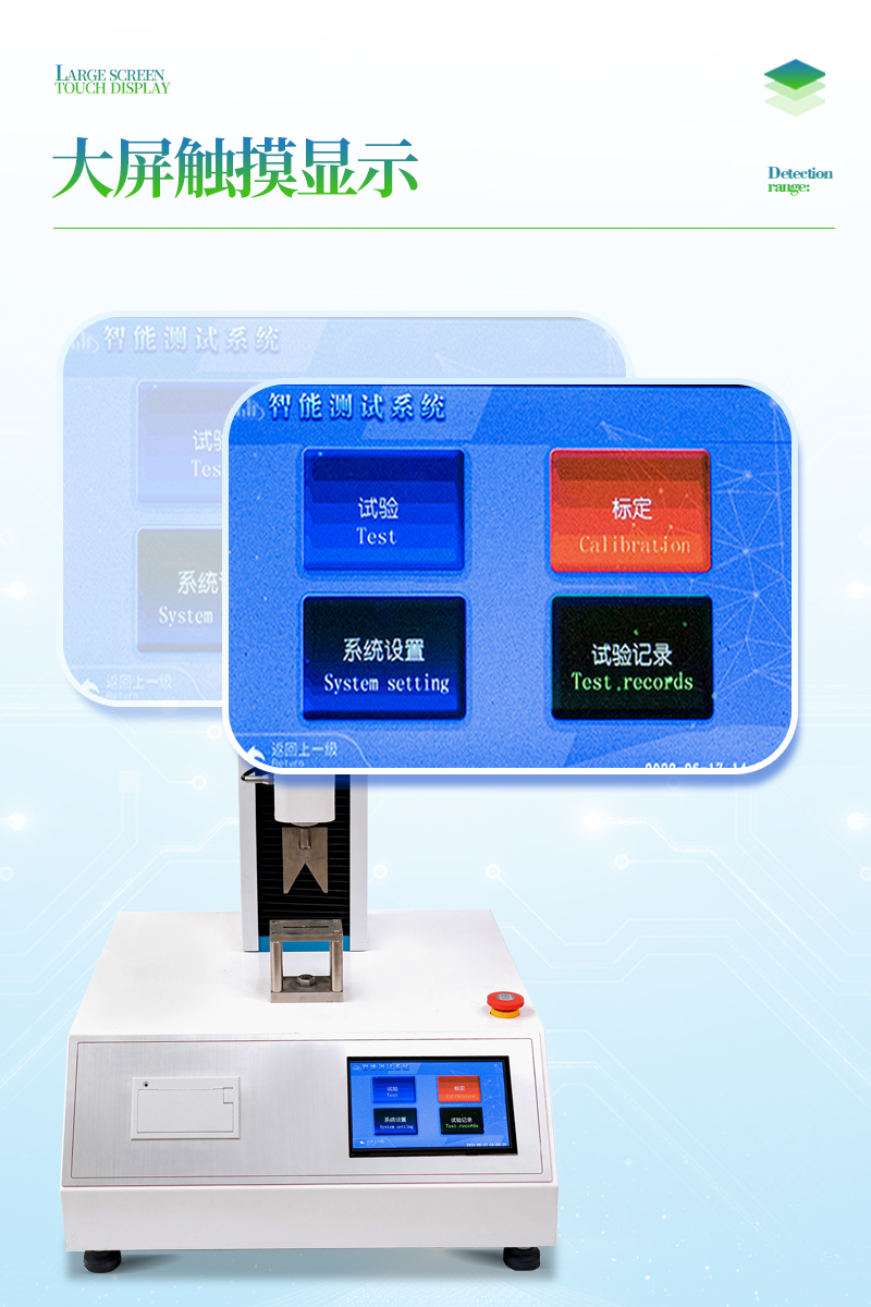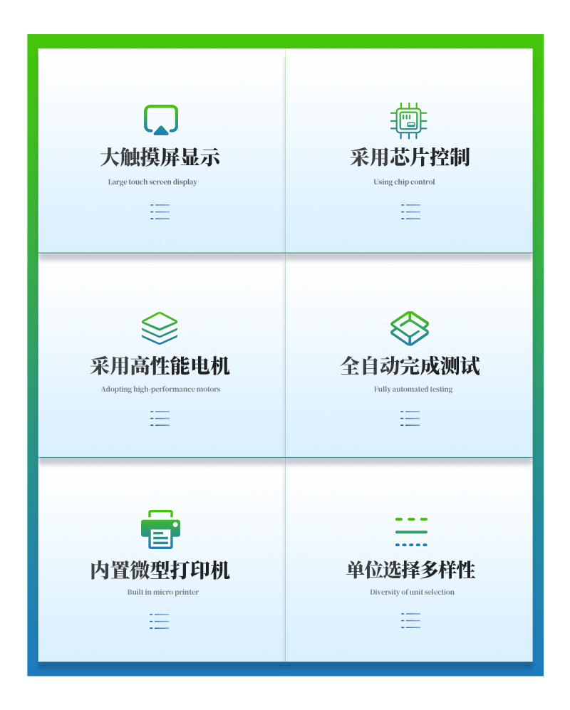 3、大觸摸屏中文顯示,友好人機(jī)界面操作。全自動完成測試。操作方便,具有測試數(shù)據(jù)統(tǒng)計(jì)處理功能,微型打印機(jī)輸出。